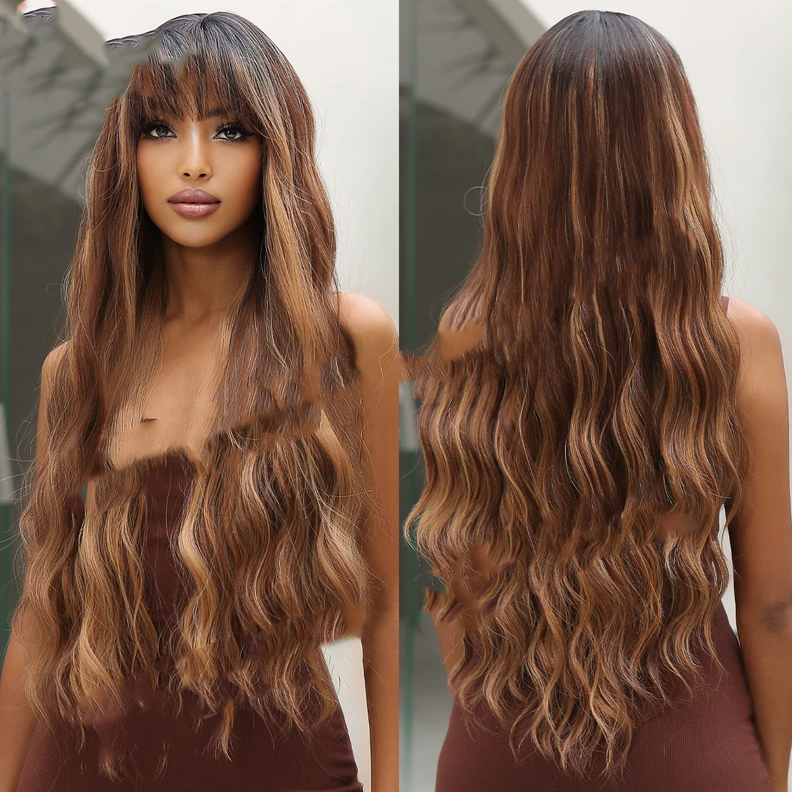 Start FRAUENHAARE Europäische Perücken Dunkelbraun gefärbt Hellbraun Pony Langes lockiges Haar Perücken Mechanismus Kopfbedeckung